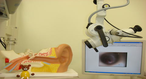 手術用顕微鏡にて、耳の中の観察、治療が可能です。また顕微鏡の画像は液晶大画面にて、患者さんと一緒に観覧可能です。