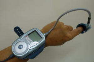 携帯用睡眠ポリグラフシステムを貸出しまして、家庭で睡眠中の鼻呼吸、気道音(いびき)の呼吸情報、及び動脈血酸素飽和度を簡単に記録できます。装置の作動はスイッチ1個であるため、容易に操作できます。